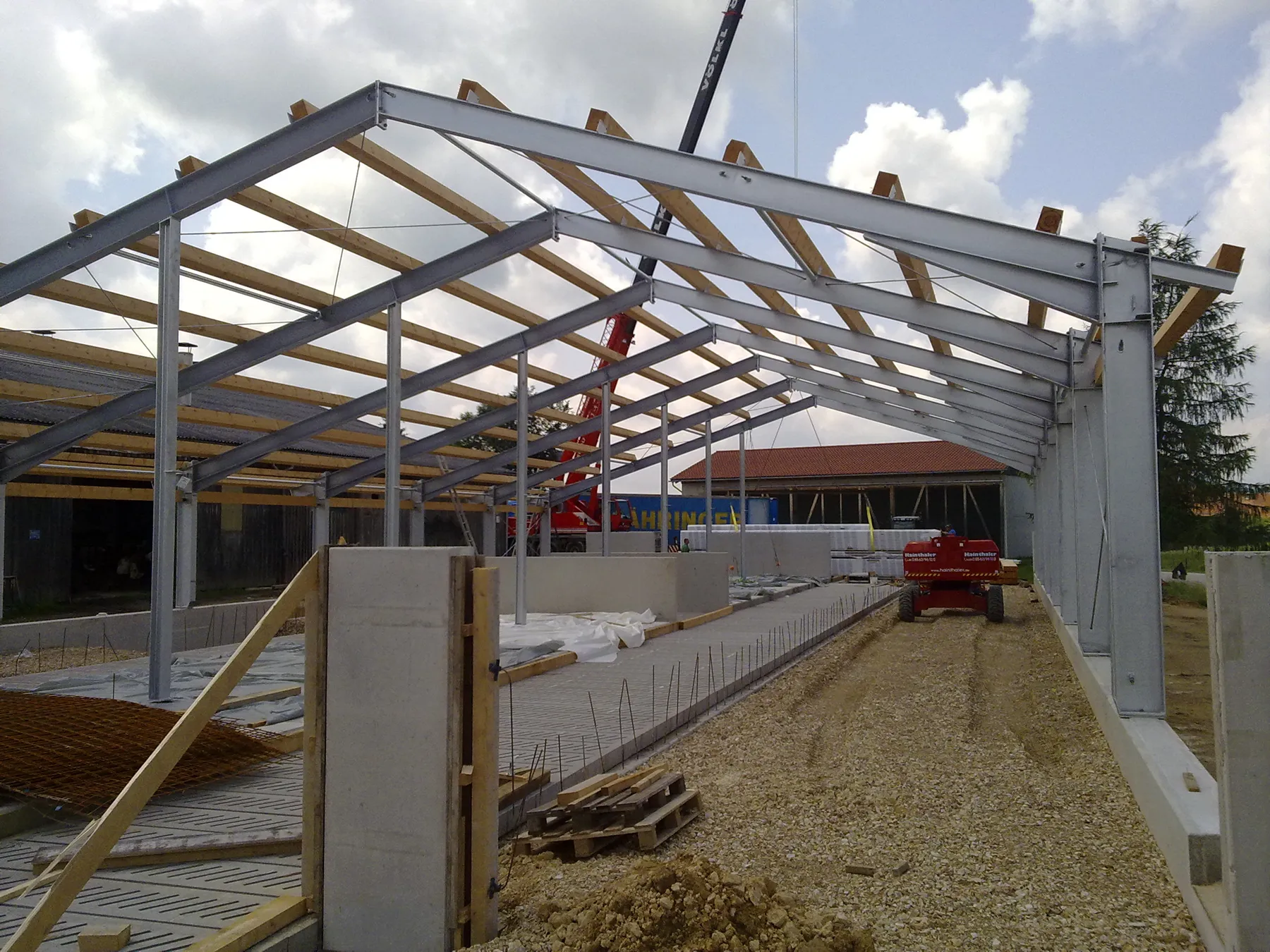 Mittelstützen aus feuerverzinkten Stahlhohlprofilen (rund oder quadratisch) oder aus HEA-Profilen, nach Wunsch des Bauherren.